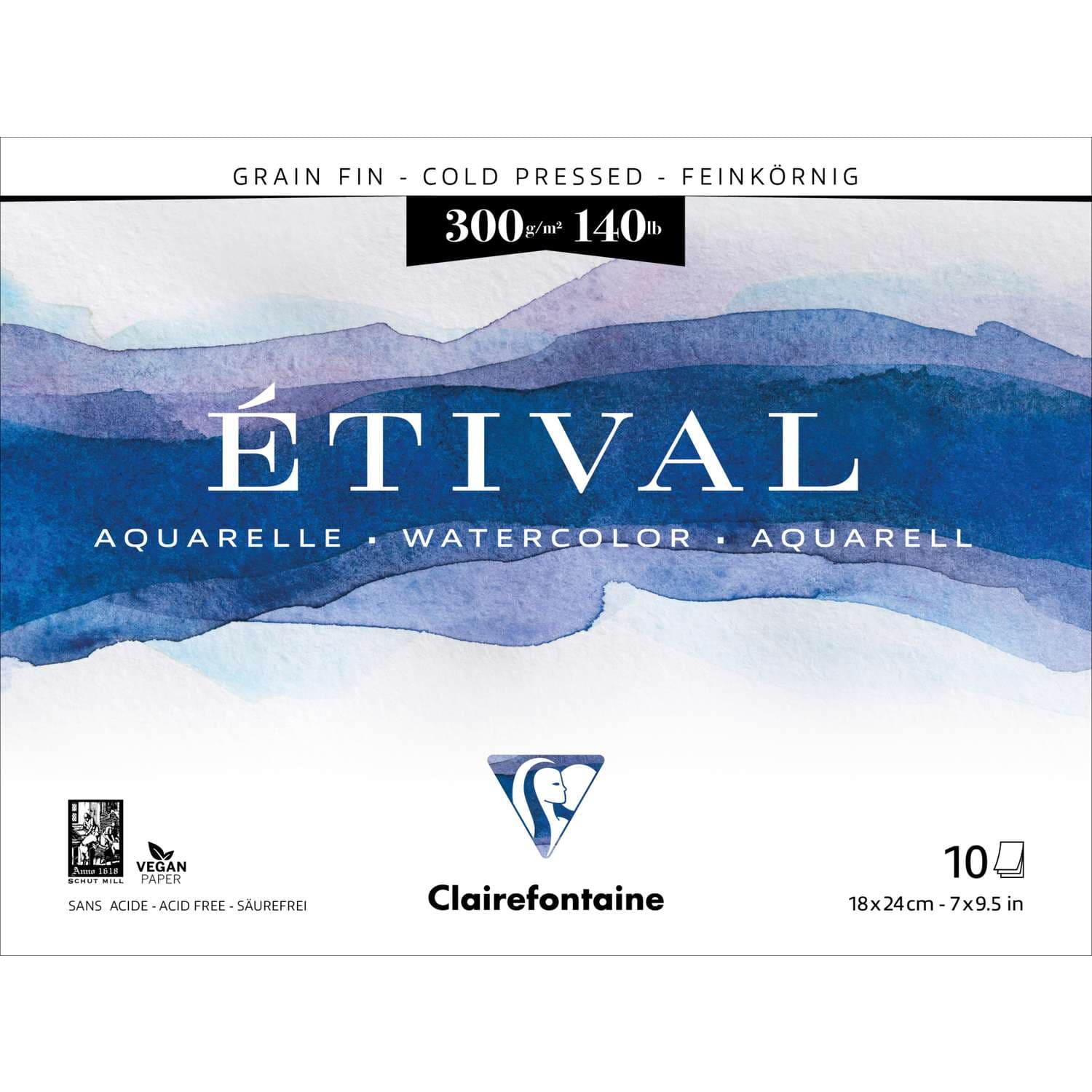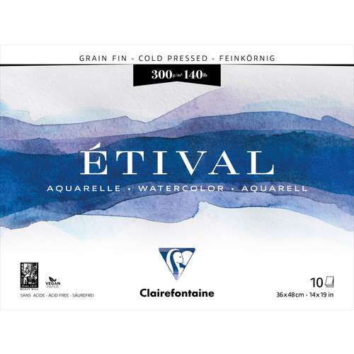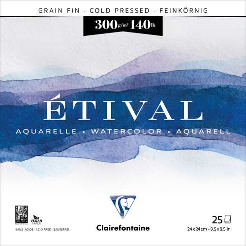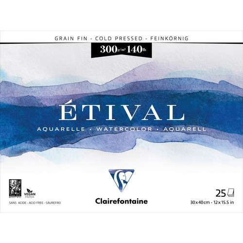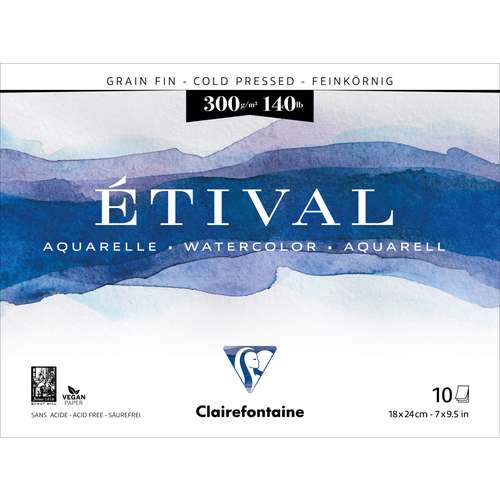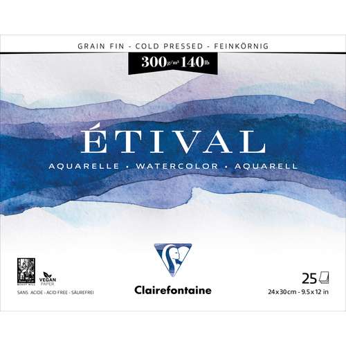 Il blocco per acquerello CLAIRFONTAINE ETIVAL contiene carta per artisti a grana fine, 300 g/m², color bianco naturale, in 100% cellulosa, prodotta tradizionalmente su una macchina a stampo cilindrico, priva di acidi con riserva alcalina, collatura neutra. Sviluppata appositamente per la pittura ad acquerello, questa carta è adatta anche a tutte le tecniche ad umido. Blocco collato su quattro lati.