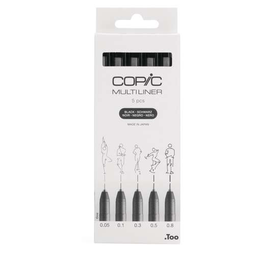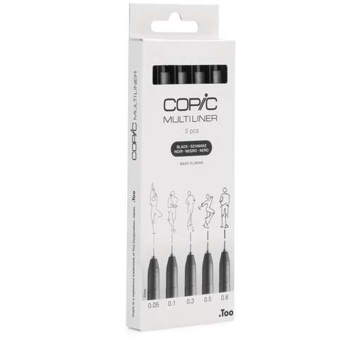 Il set COPIC® Multiliner contiene 5 pennarelli neri a punta fine che consentono una precisione incredibilmente dettagliata. I pennarelli contengono inchiostro a base di pigmenti, resistente alla luce, all'acqua e all'alcol.