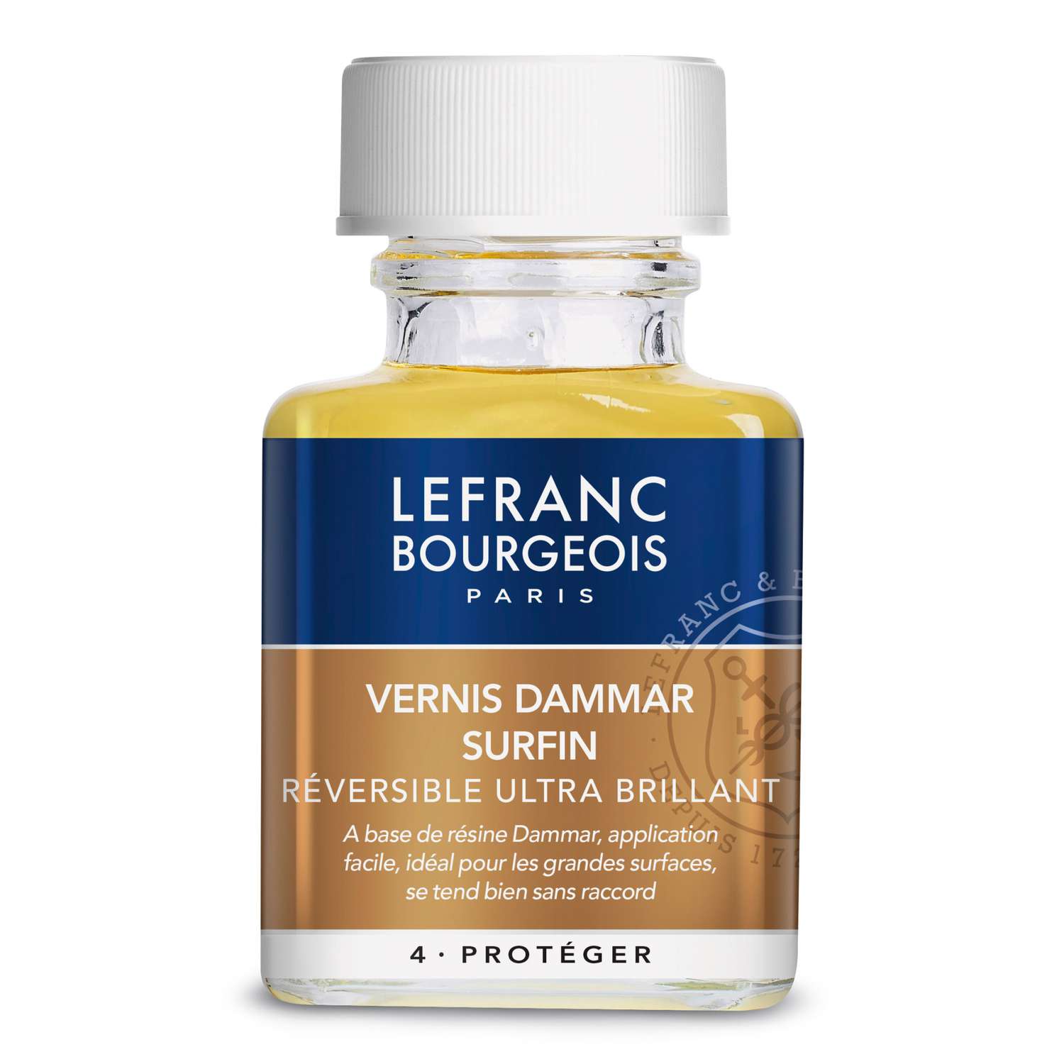 Vernice trasparente Dammar dalla casa Lefranc&Bourgeois. Si riconosce dalla naturale chiarezza. Facile da applicare perchè evapora poco. Non utilizzarla in caso di molta umidità. È adatta alle grandi superfici. Prezzo per flacone.