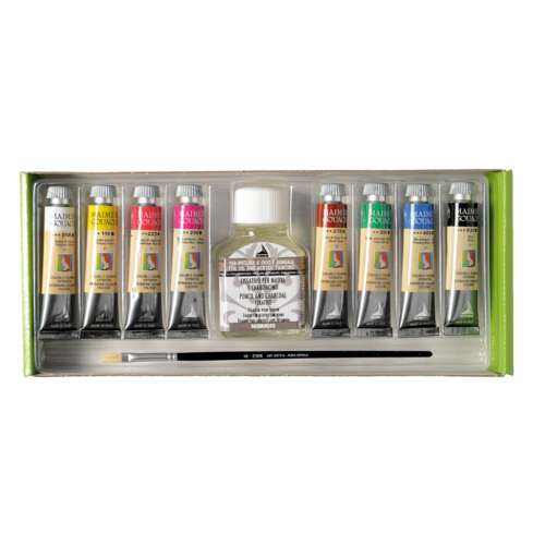 Il set introduttivo di Maimeri Gouache extrafine è presentato in una scatola di cartone che contiene 8 tubetti assortiti da 20 ml, 1 flacone da 75 ml di fissativo per matita e carboncino e 1 pennello sintetico. La gouache extrafine di Maimeri è l'epitome della raffinatezza. Una collezione di colori a tempera che prende il nome da un'antica tecnica in cui i colori diventano più riflettenti e opachi quando vengono miscelati con gomma arabica di alta qualità. Il risultato è una finitura sottile e unica, più ricca e sofisticata rispetto ai colori a tempera standard. Realizzata con pigmenti pregiati, la Gouache Maimeri una volta asciutta assume una tonalità leggermente più chiara, sviluppando un aspetto satinato e perlato che può essere riattivato con l'acqua. La sua qualità luminosa è particolarmente esaltata quando viene utilizzata su carta colorata o su sfondi grezzi e strutturati, creando un effetto sorprendente che cattura lo sguardo.