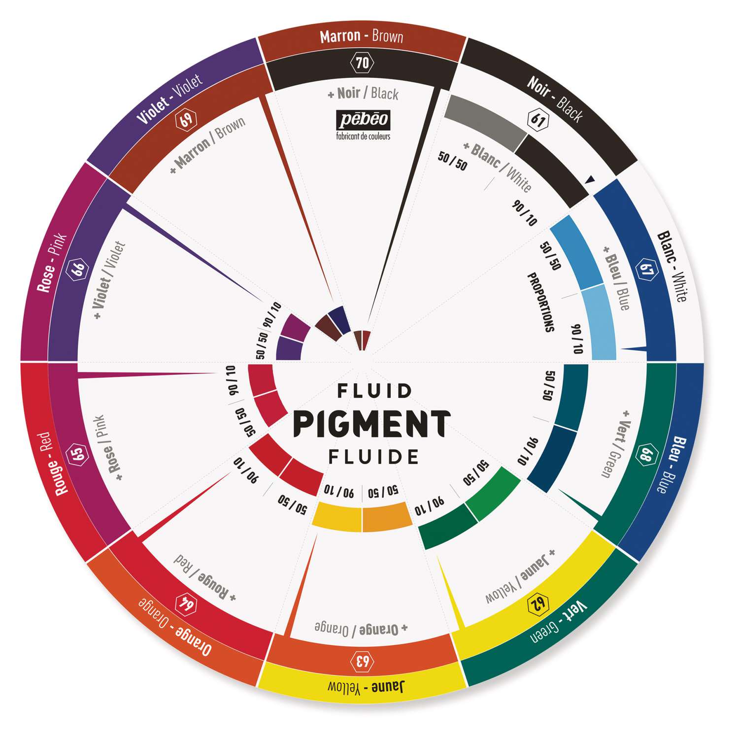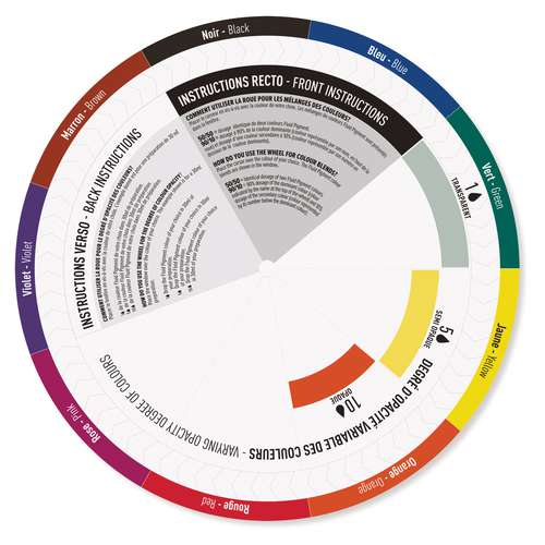 La ruota cromatica Fluid Pigment è uno strumento progettato appositamente per i colori Fluid Pigment Pébéo. Lato frontale: indicazioni su come dosare 2 colori per ottenere una determinata tinta; lato posteriore: indicazioni sulla trasparenza e opacità di un determinat...