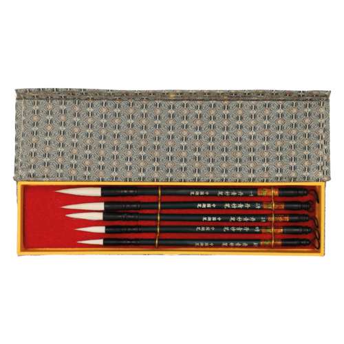 Pennello in cinque misure diverse in pelo di capra. Ghiera e manico in corno verniciati neri. Scatola di broccato preziosa.